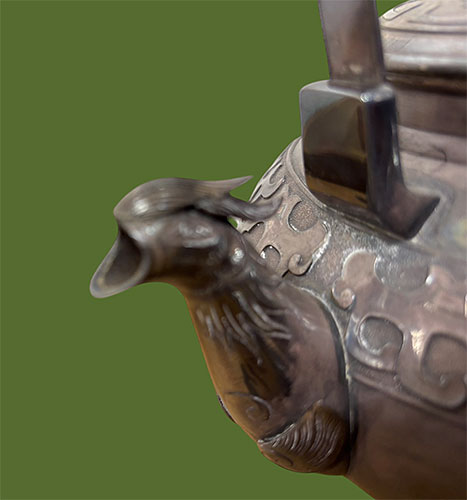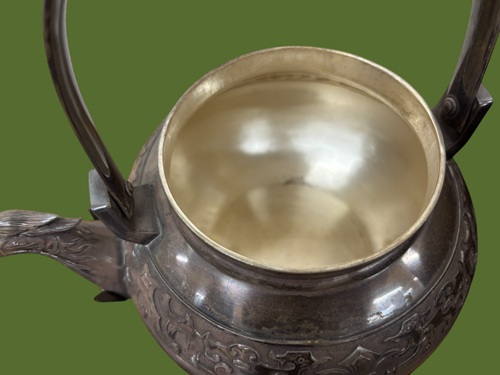 注ぎ口は鉄砲口です。銘 が彫られています。取手のデザインもたいへん面白く味わいのある 銀瓶 です。