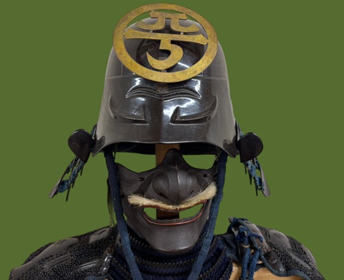 黒ベースの本体に、大きな鍬型 (くわがた)、武士の家紋前立 (まえだて)、それにうまくマッチする茶系の家地。