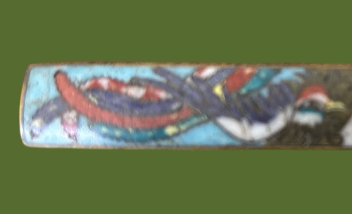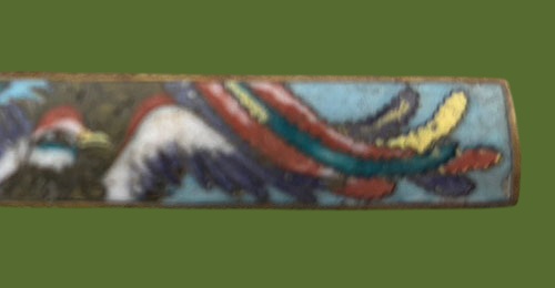 この七宝焼きは 刀装具 の小柄で、時代は明治時代頃の作品だと思われます。 この作品は 七宝焼 のなかでも有線七宝で出来ている 逸品 で、珍しくこのような刀装具に施されております。 七宝焼 の中でも刀装具でデザインが面白く、可愛らしい作品で、有線七宝 の細工も非常に細かく丁寧で、当時の 職人技 が際立つ 逸品です。 しっかりした作りで 重量感 もあり、有線七宝 で、鮮やかな孔雀の 図柄 が綺麗に作られた逸品 です。 長年の時代を経てきた味わいがあり割れたり、欠けたりしている所は無く、綺麗な 保存状態 です。