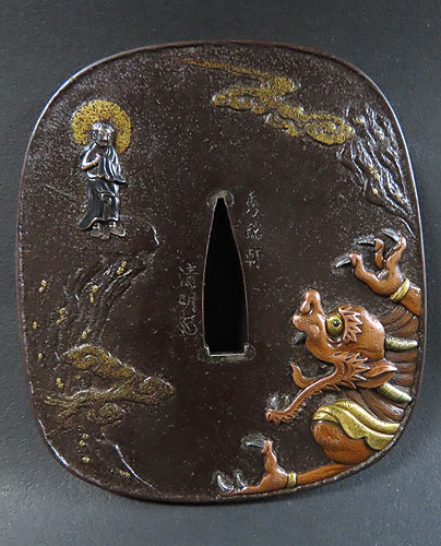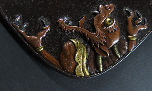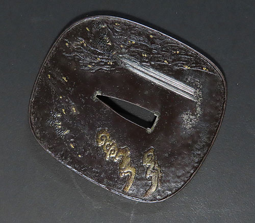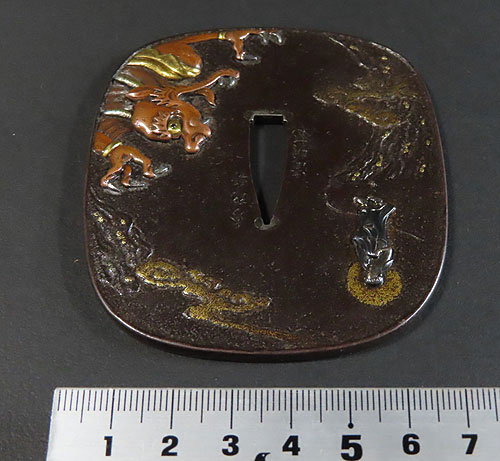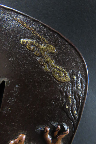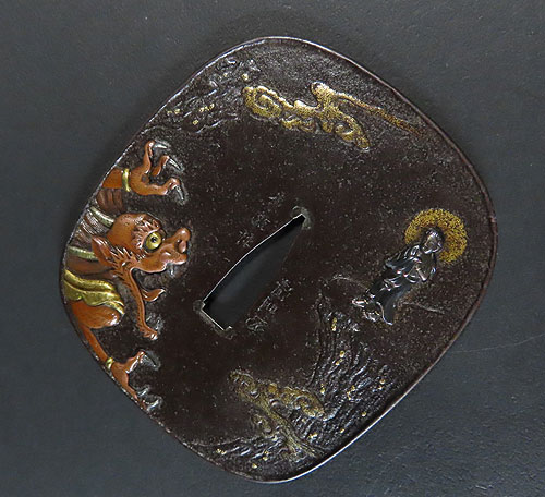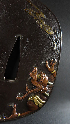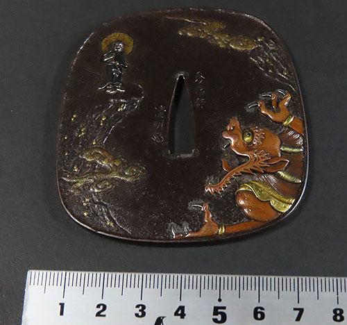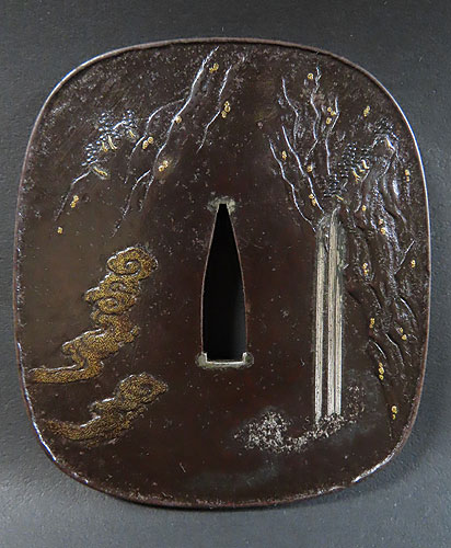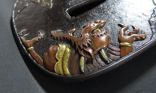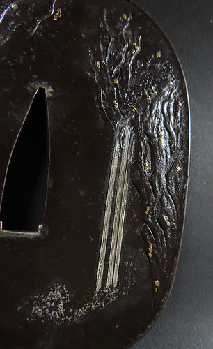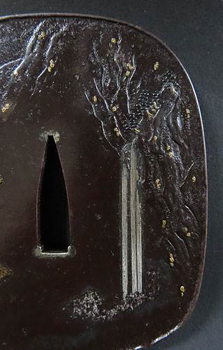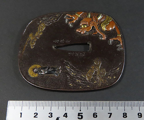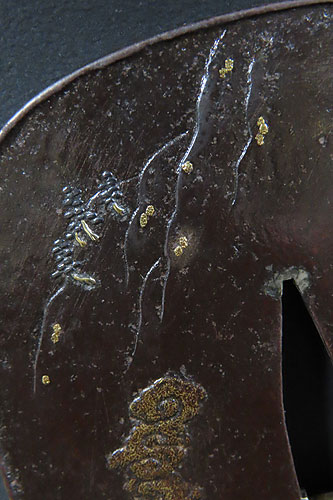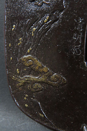 大ぶりの鍔で、鉄地に象嵌細工や彫金細工が施されております。