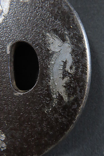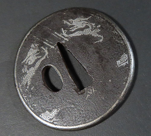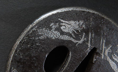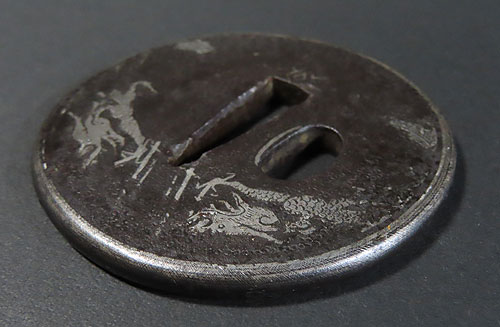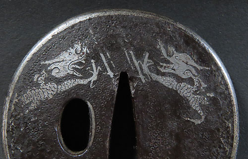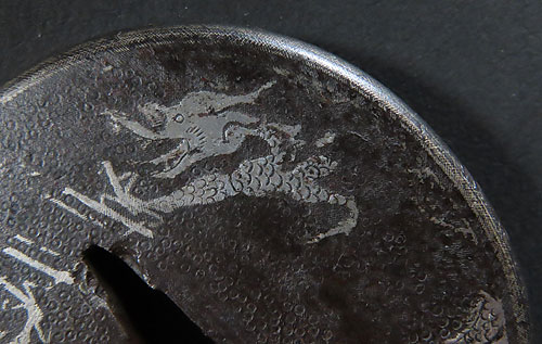 鍔 の周りにも銀象嵌が施されており、また裏面には二匹の龍の銀象嵌が施されていたようです。