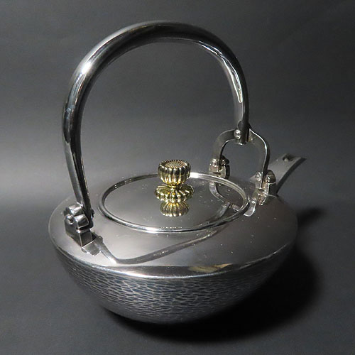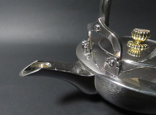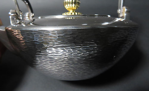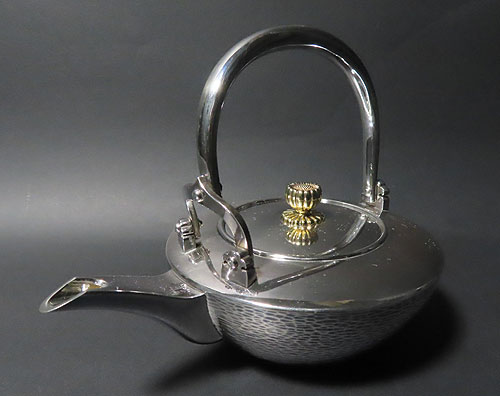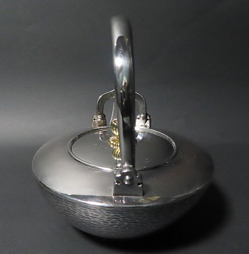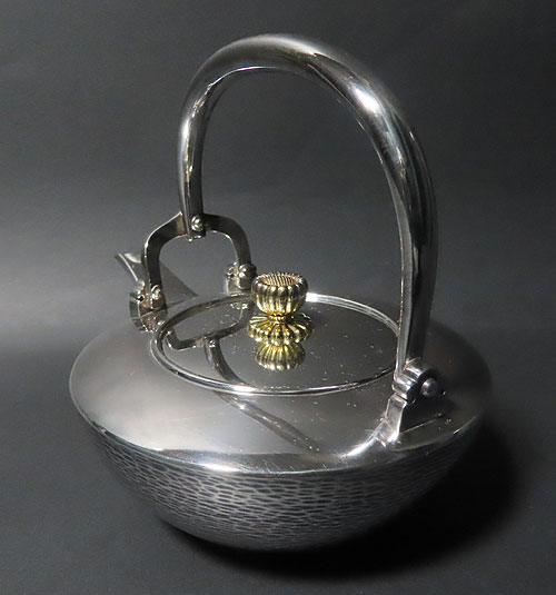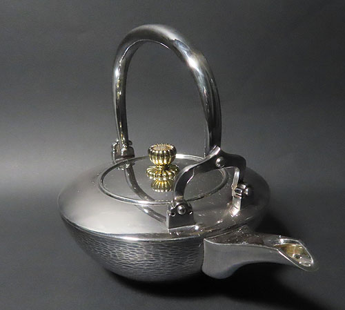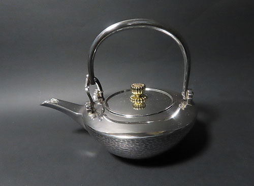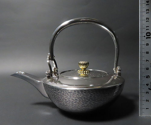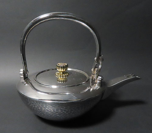 地模様の優雅さが存在感を高めています。純銀製品です。煎茶道具の銀瓶で、共箱 です。