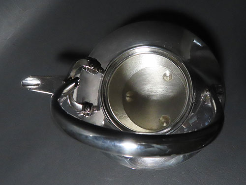 注ぎ口は鉄砲口です。銘 が彫られています。取手のデザインもたいへん面白く味わいのある 銀瓶 です。
