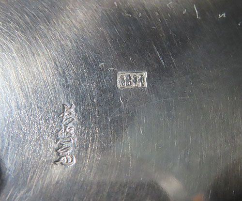 取っ手の部分は、竹で巻いており、非常に美しく作られています。底に「純銀」の 刻印 と 銘 が入っています。