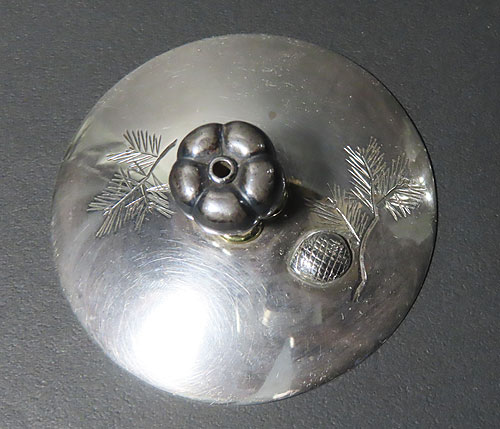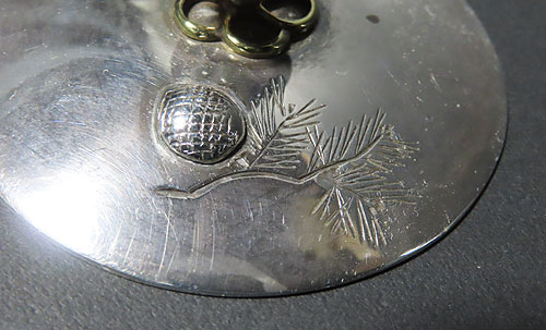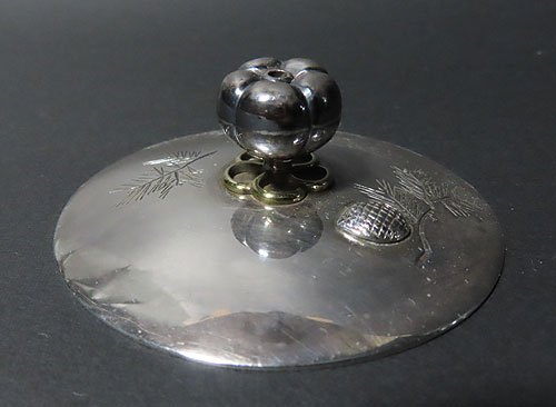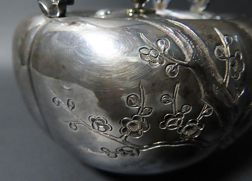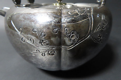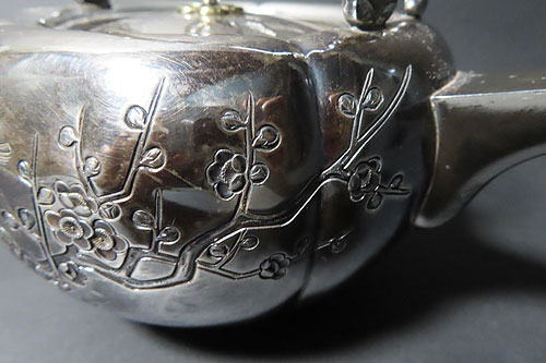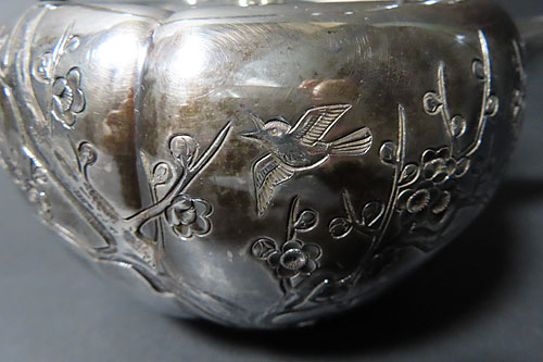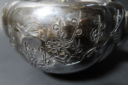 四季の草花の 彫刻 が丁寧に施されており、愛好家 の間では貴重な名品です。昔の品物で、銀の変色が見られます。