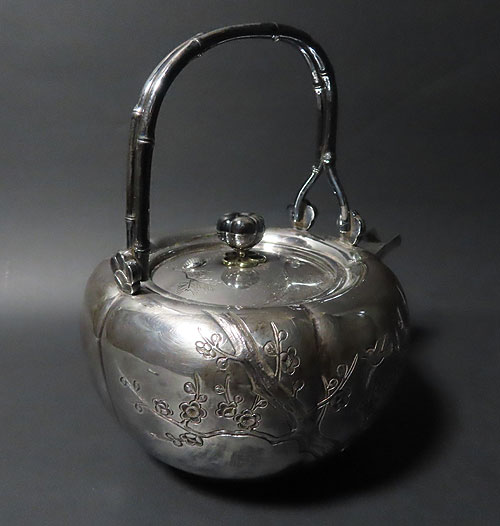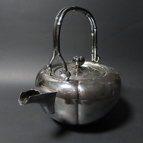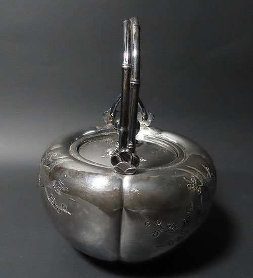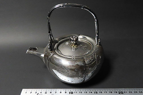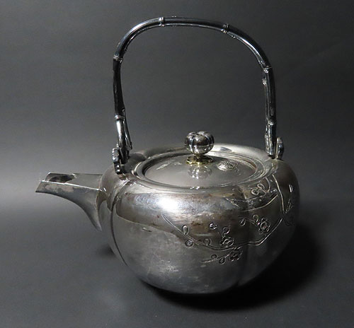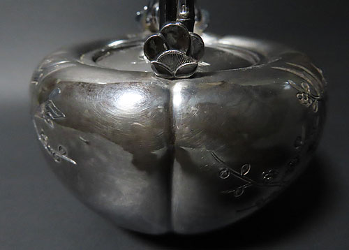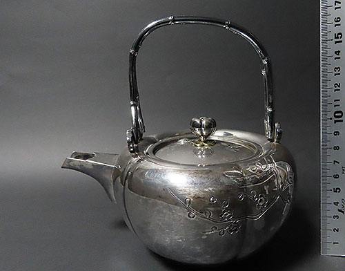 地模様の優雅さが存在感を高めています。純銀製品です。煎茶道具の銀瓶で、共箱 です。