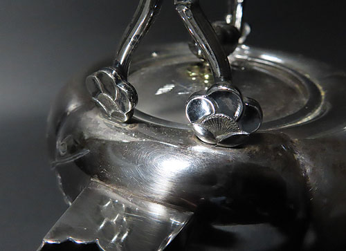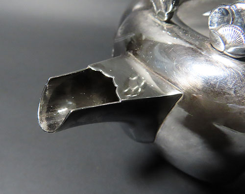注ぎ口は鉄砲口です。銘 が彫られています。取手のデザインもたいへん面白く味わいのある 銀瓶 です。