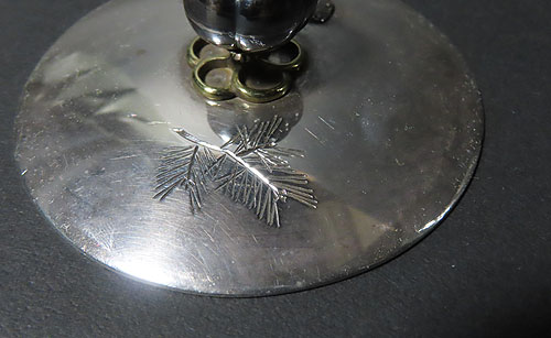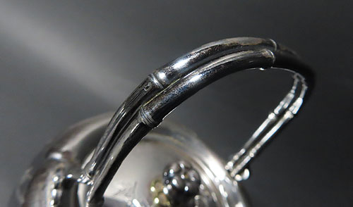 取っ手の部分は、竹で巻いており、非常に美しく作られています。底に「純銀」の 刻印 と 銘 が入っています。