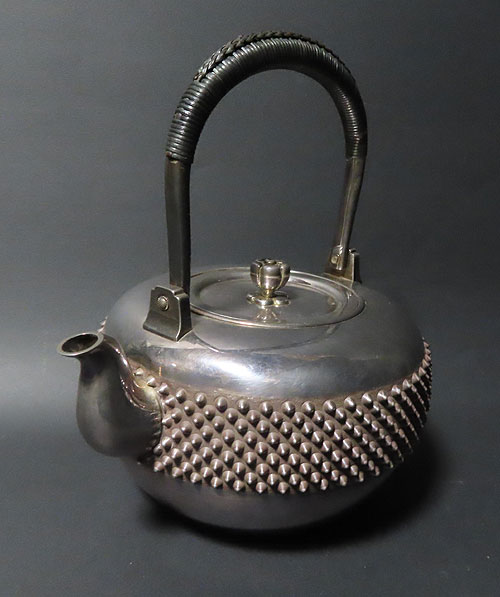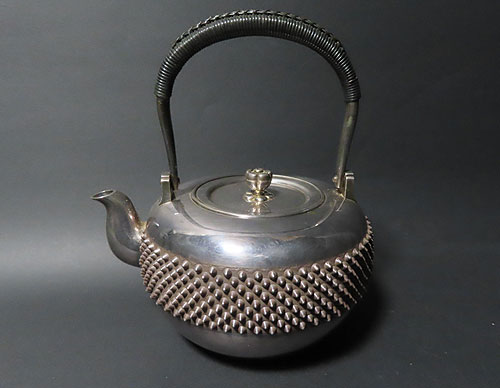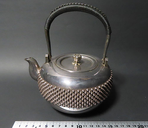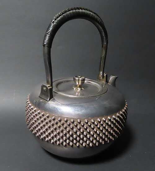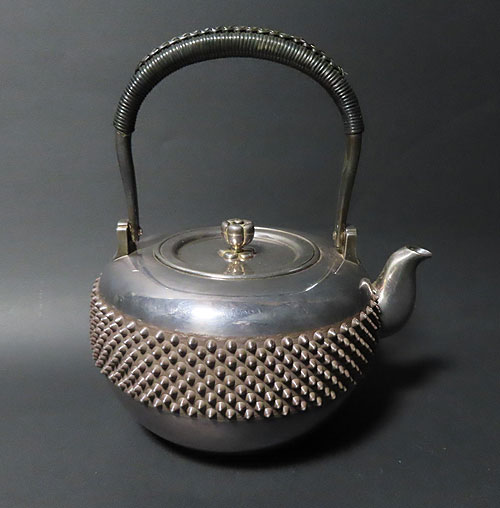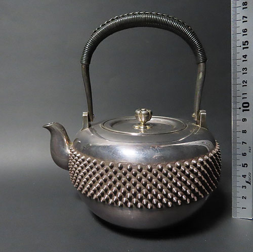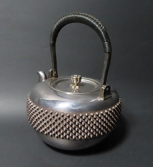 地模様の優雅さが存在感を高めています。純銀製品です。煎茶道具の銀瓶で、共箱 です。