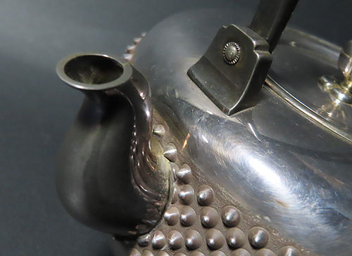 注ぎ口は鉄砲口です。銘 が彫られています。取手のデザインもたいへん面白く味わいのある 銀瓶 です。