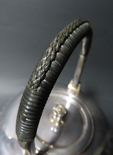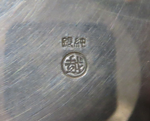 取っ手の部分は、竹で巻いており、非常に美しく作られています。底に「純銀」の 刻印 と 銘 が入っています。