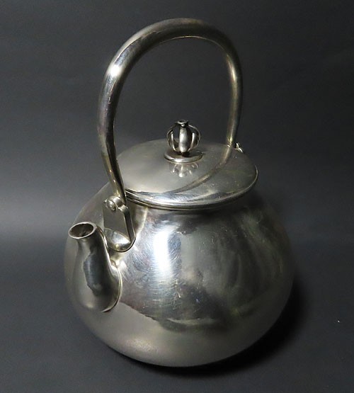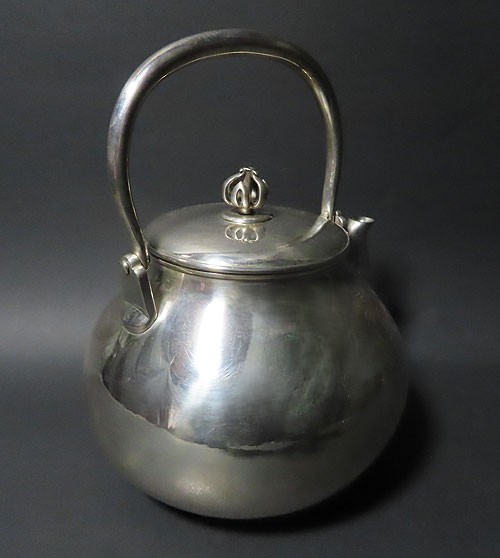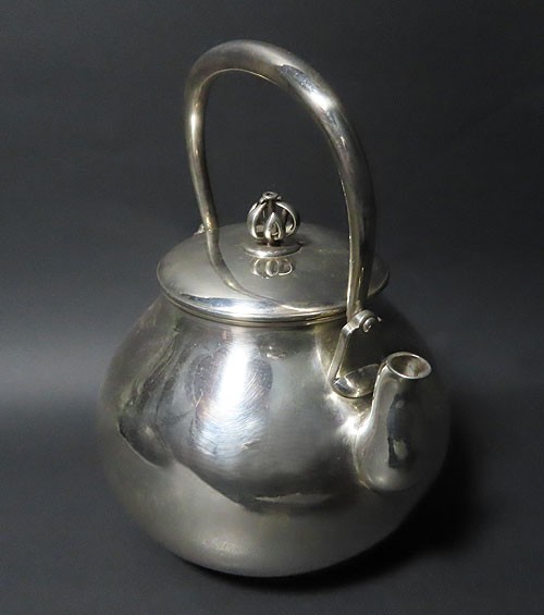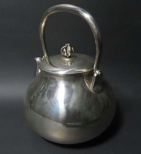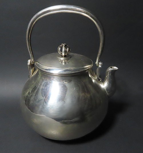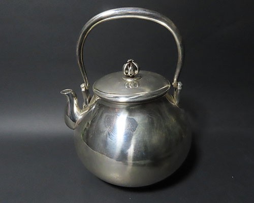 地模様の優雅さが存在感を高めています。純銀製品です。煎茶道具の銀瓶で、共箱 です。