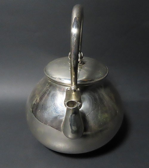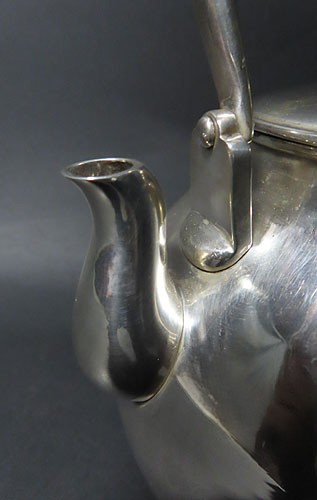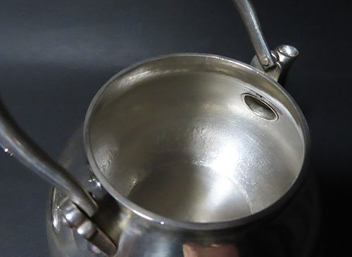 注ぎ口は鉄砲口です。銘 が彫られています。取手のデザインもたいへん面白く味わいのある 銀瓶 です。