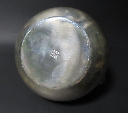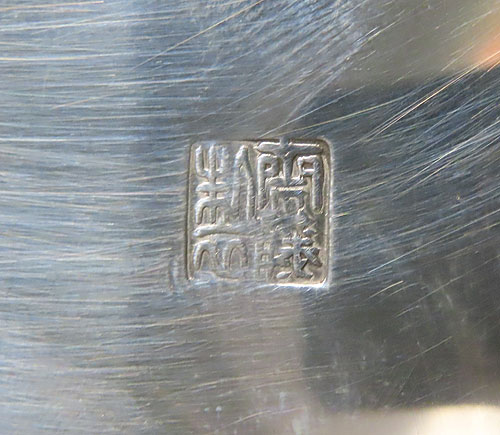 取っ手の部分は、竹で巻いており、非常に美しく作られています。底に「純銀」の 刻印 と 銘 が入っています。