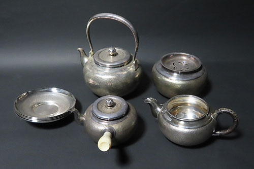 明治時代に作られたこの煎茶道具セットで、材質は純銀製です。