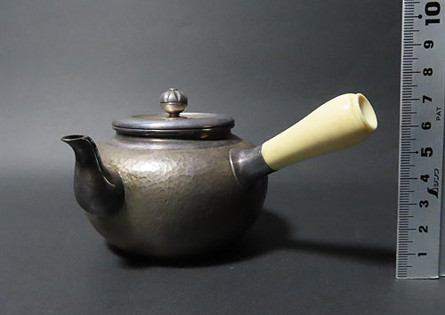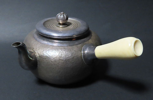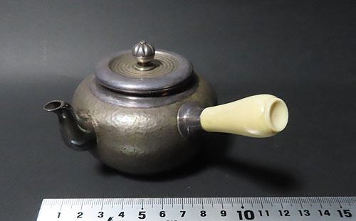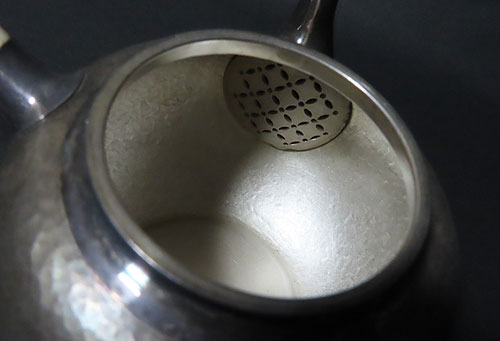 持ち手は牙で作られ、内側も彫金細工の細かい技法が施され、昔ながらの急須です。