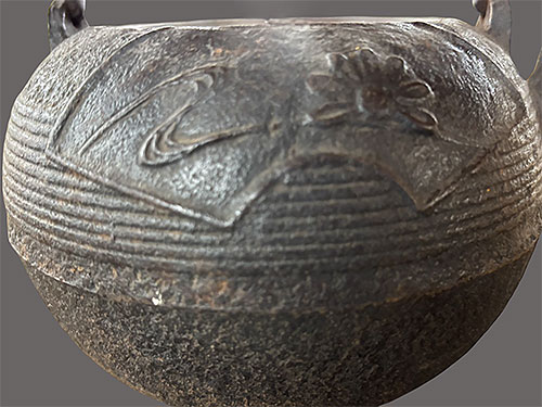当時の 職人技 を創意工夫して表現された 逸品 で、彫金細工が面白く、現在では見られない珍しい鉄瓶です。