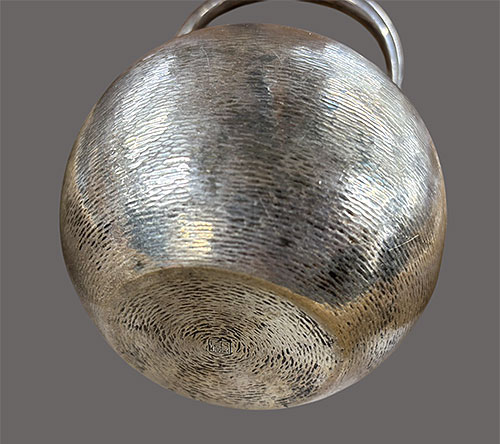取っ手の部分は、竹で巻いており、非常に美しく作られています。底に「純銀」の 刻印 と 銘 が入っています。