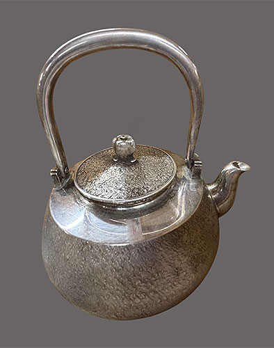 地模様の優雅さが存在感を高めています。純銀製品です。煎茶道具の銀瓶で、共箱 です。