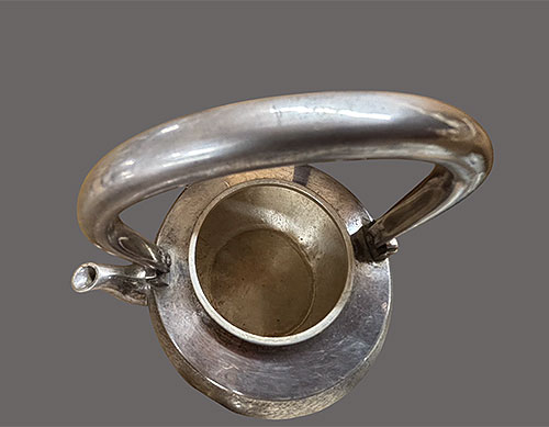 注ぎ口は鉄砲口です。銘 が彫られています。取手のデザインもたいへん面白く味わいのある 銀瓶 です。