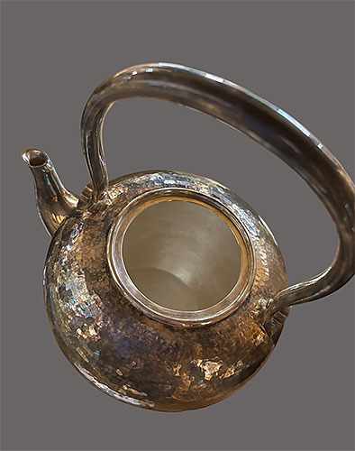 地模様の優雅さが存在感を高めています。純銀製品です。煎茶道具の銀瓶で、共箱 です。
