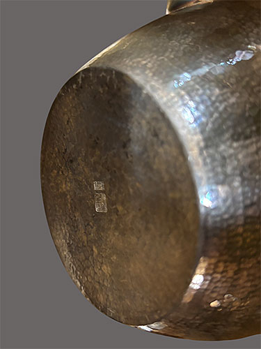 取っ手の部分は、竹で巻いており、非常に美しく作られています。底に「純銀」の 刻印 と 銘 が入っています。