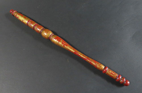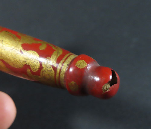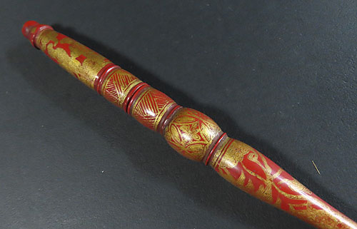 このような金工作品の矢立には象嵌模様や彫金細工が施されて、非常に高価な作品もあります。