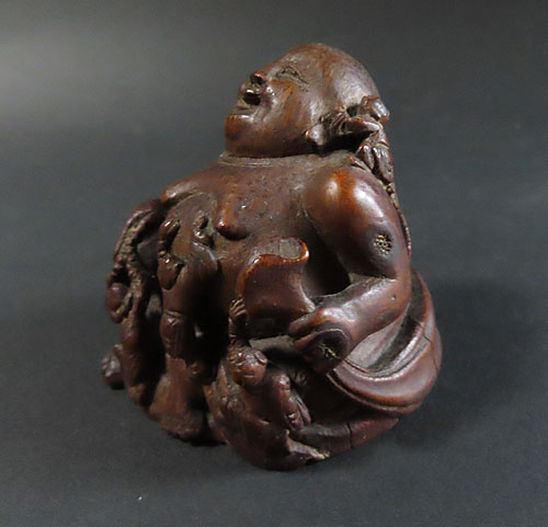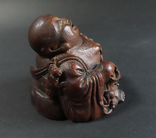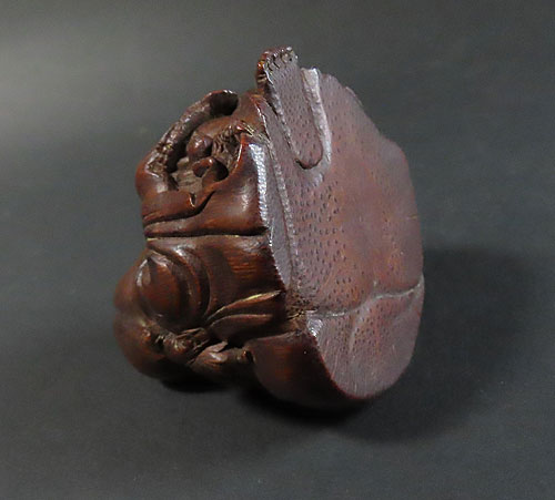 ユーモラスなモチーフが楽しい根付です。表情も面白く細部まで丁寧に彫られており、昔の 職人技 が素晴らしく、人物の表情が面白い珍品です。