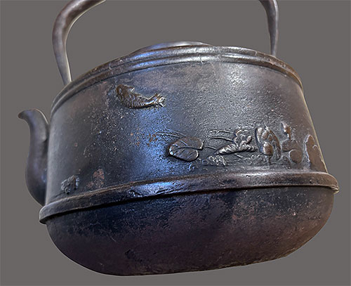 当時の 職人技 を創意工夫して表現された 逸品 で、彫金細工が面白く、現在では見られない珍しい鉄瓶です。