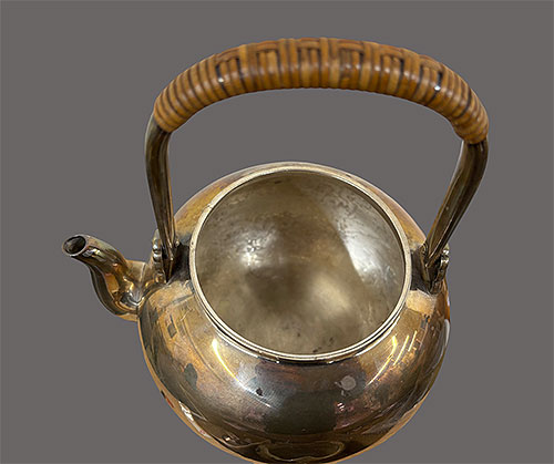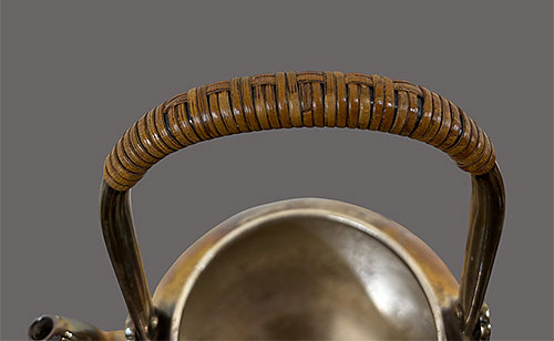 取っ手の部分は、竹で巻いており、非常に美しく作られています。底に「純銀」の 刻印 と 銘 が入っています。