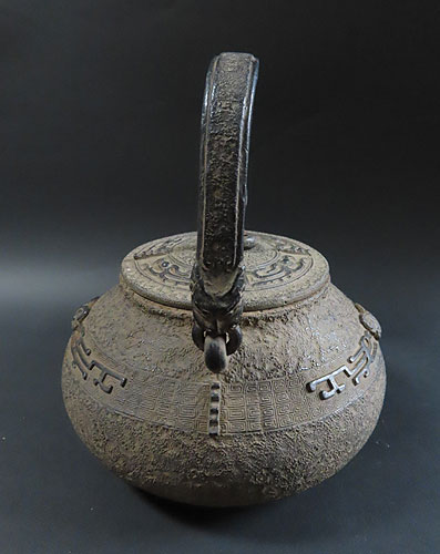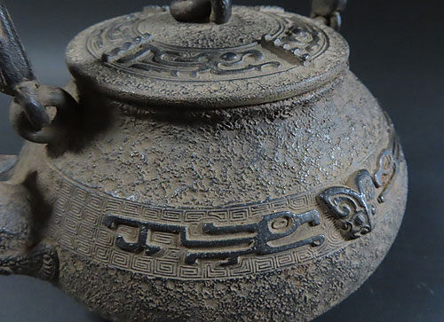 丁寧に作られており、側面に文字が書かれた図模様で、日本の昔の 職人技 が見られる鉄瓶です。