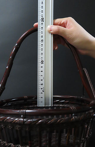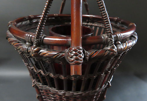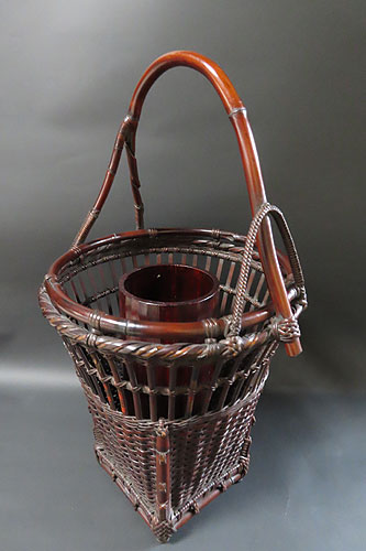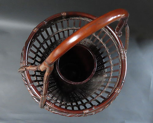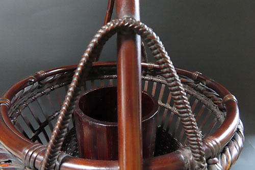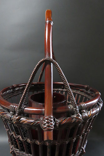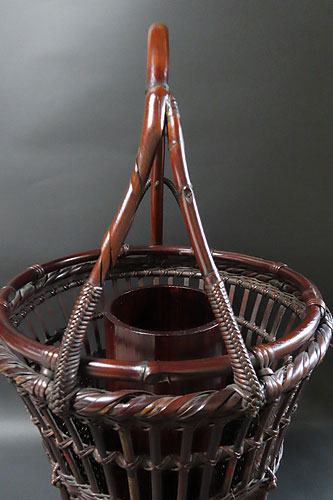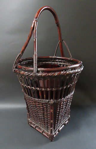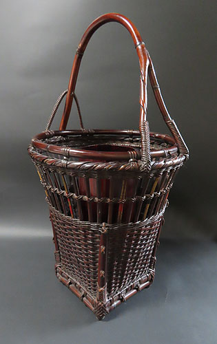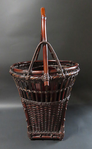 この作品の材料に使われている竹は、現在では手に入らない煤竹で、昔の囲炉裏端で百年以上燻され、天然の色合いが素晴らしい、貴重な味わいのある作品です