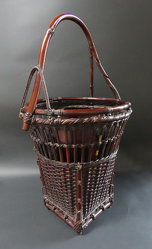 いろいろな種類の竹籠がありますが、一般的には日本の竹籠は、昔の囲炉裏端で使われていた煤竹が使用されています。