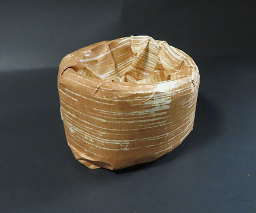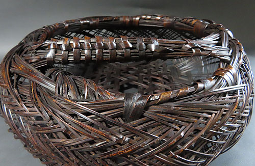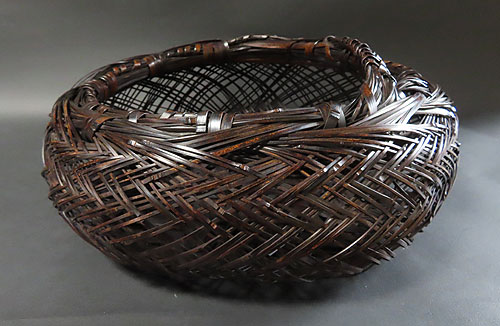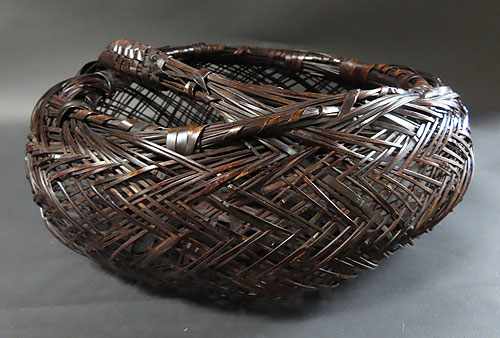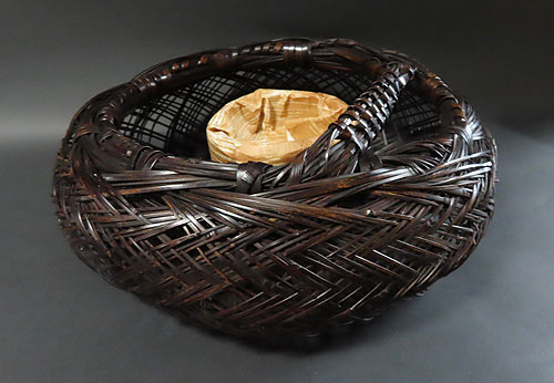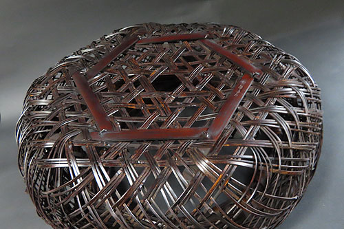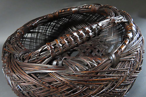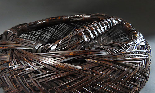 この作品の材料に使われている竹は、現在では手に入らない煤竹で、昔の囲炉裏端で百年以上燻され、天然の色合いが素晴らしい、貴重な味わいのある作品です