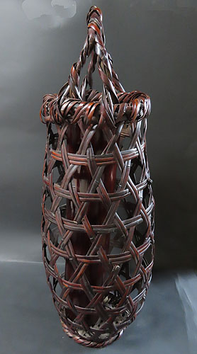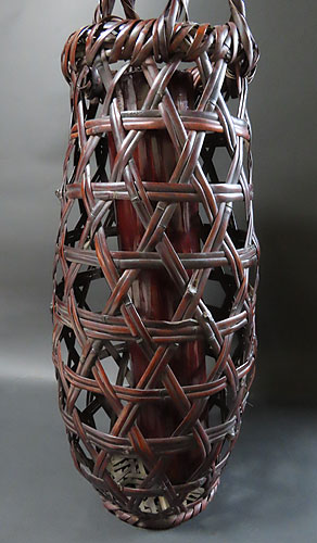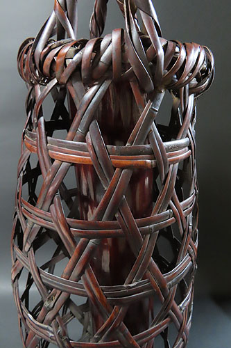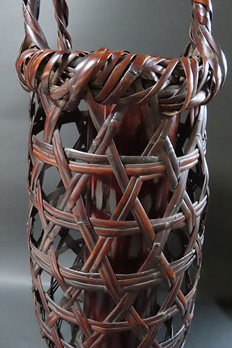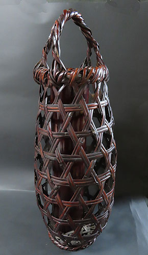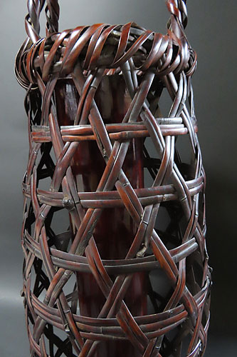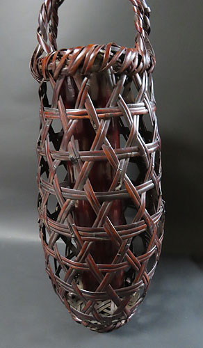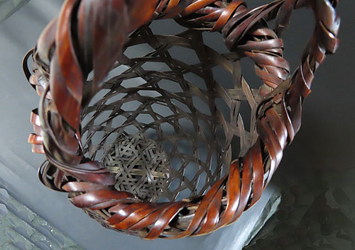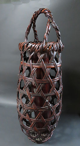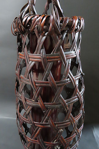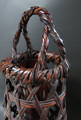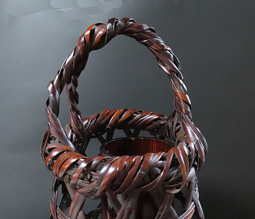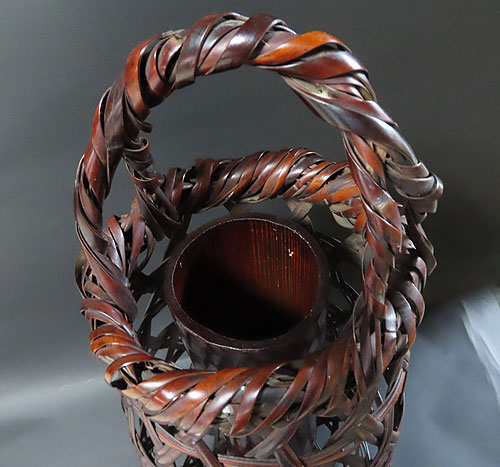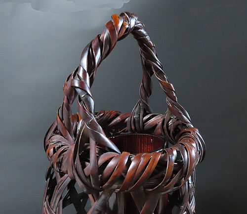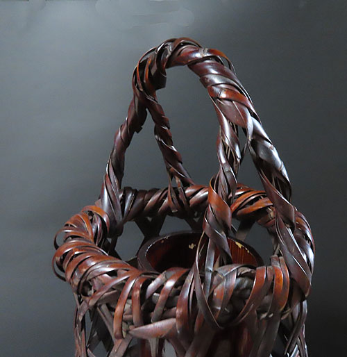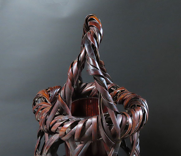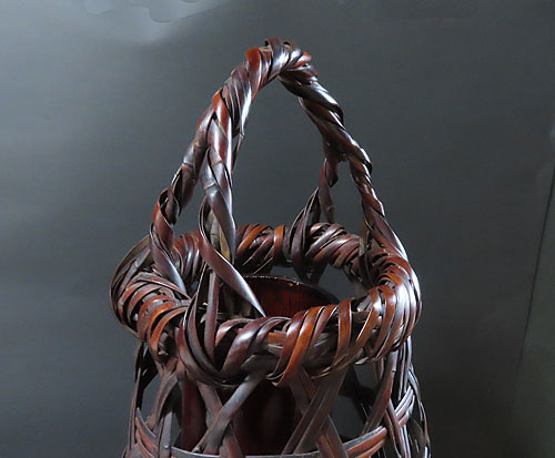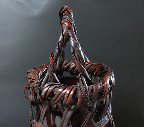 この作品の材料に使われている竹は、現在では手に入らない煤竹で、昔の囲炉裏端で百年以上燻され、天然の色合いが素晴らしい、貴重な味わいのある作品です