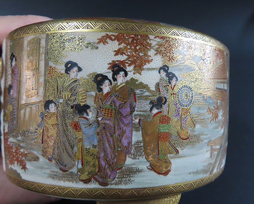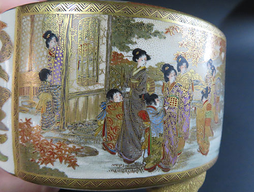 写真をご覧のように美人画や花鳥の 図柄 が 細密 に丁寧に描かれており、すべて手描きの上品で優雅な作品で、ご覧のように、大ぶりで風格がある薩摩焼です。