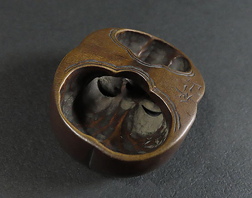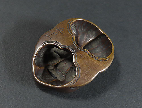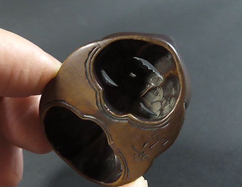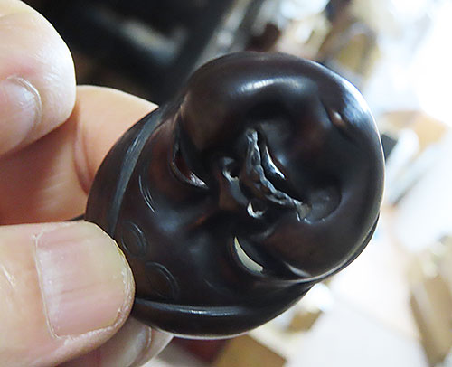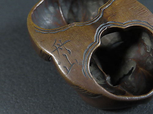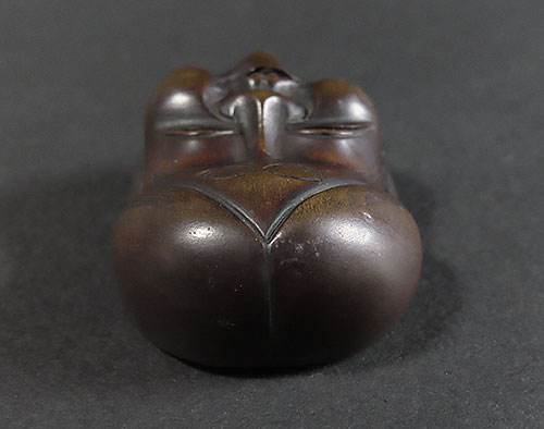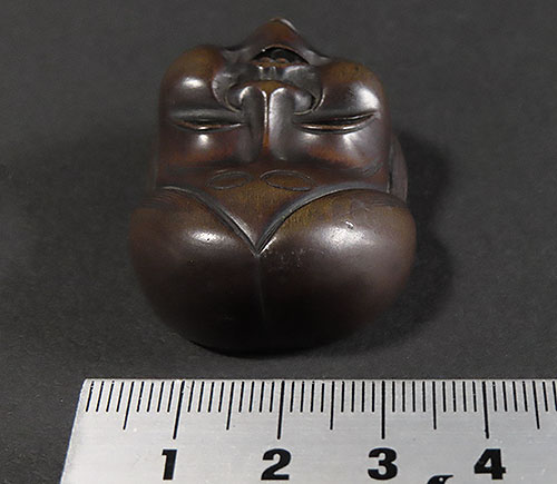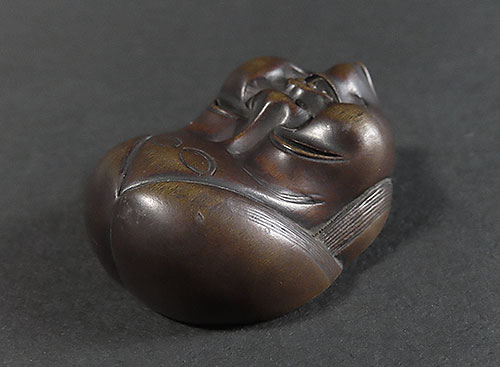 木刻のお多福の面根付に巧みなり。彫風より見るに、おそらく初代舟月の門下になるべし。