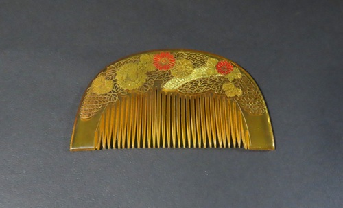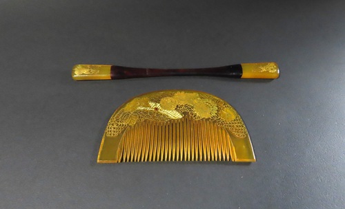 この櫛・笄のように、べっ甲の材質に蒔絵や螺鈿細工が施されている作品は珍しく、昔の職人技が冴える逸品です。