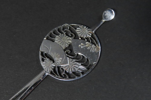 銀地に菊や流水の 蒔絵 が描かれ、螺鈿細工が施されており、角度を変えて見ると、きらきら光っております。