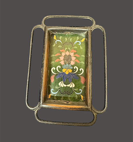 このような形の引き手は珍しく、中の 七宝焼 も華やかな 図柄 です。