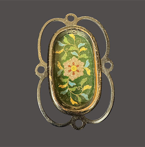 このような形の引き手は珍しく、中の 七宝焼 も華やかな 図柄 です。