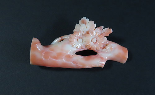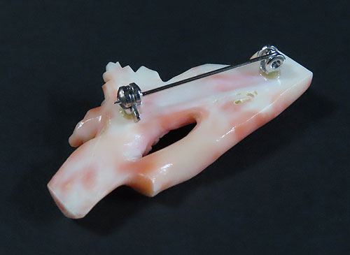 帯留めの珊瑚の工芸品ですが、最近ではブローチにされるお客様が多くおられます。