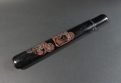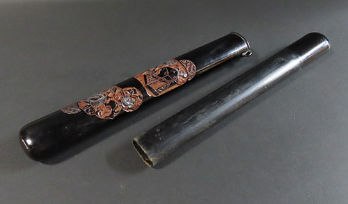 古道具の骨董品宅配買取依頼を頂き、アンティークの彫り物が施された煙管筒をお譲り頂きました。