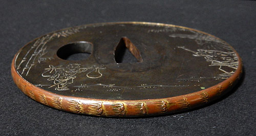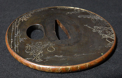 片切彫 で竹や川、人物が彫金されており、古い時代の、丁寧で味わいのある職人技が冴える逸品です。