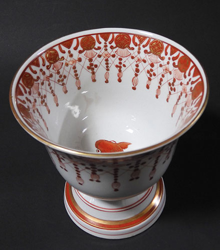瓔珞模様や見込みの金魚が 細密 に描かれており、非常に美しい 赤絵 の鉢です。