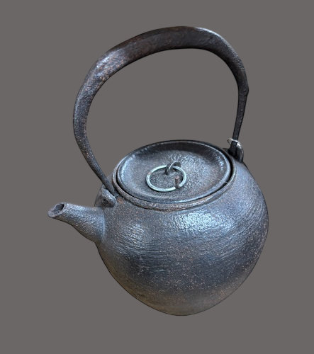 写真4枚あります。くわしくはこちら 明治から大正時代頃の骨董品で抹茶道具や 煎茶道具 で使う 茶道具 の 鉄瓶 で買取ました。骨董品 の古い鉄瓶で特別良い鉄瓶ではありませんが、鉄砲口なので紹介します。このような骨董品の鉄砲口の鉄瓶は日本の昔の 職人技 が見られる 逸品 で買取ました。持ち手は象嵌細工も無く、簡単な持ち手です。蓋の摘みは銀製品ですが、簡単な摘みで評価はしにくいです。しかし水漏れ等無く、保存状態 も良い骨董品の鉄瓶です。この作品は、競り市やオークションで買い受けた鉄瓶ではありません。直接お客様より入荷した、うぶ荷と呼ばれる貴重な蔵出しの骨董品の鉄瓶で、現状のまま販売しております。 鉄瓶とは江戸時代に元々茶道具として考案されましたが、明治時代頃には一般的には民具として復旧し、私の家にも一つありました。その後、やかんも製造されるようになり、一度に多くのお湯を沸かせる手段が出来た為、あまり重要視されないようになりました。漢方薬を大切にしている中国では鉄分の吸収が良いと人気の中国茶の御道具です。