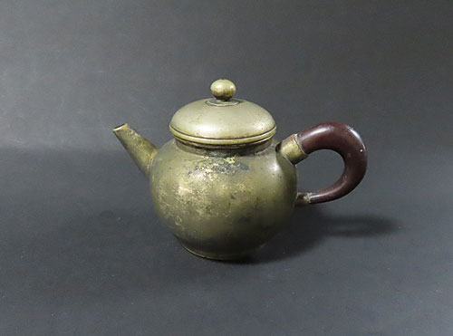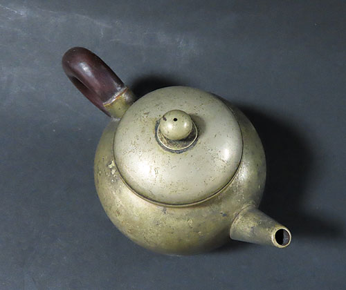 煎茶道具の小さな急須で、持ち手が唐木で出来た金工作品の 急須 です。