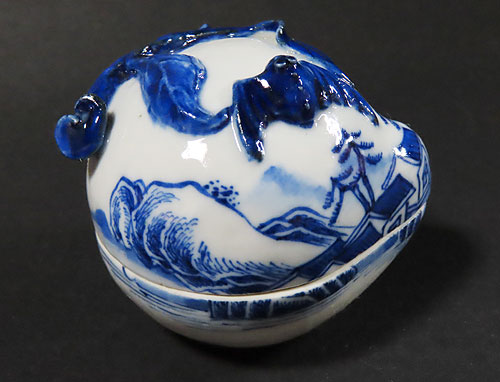 染付の 香合 で、お香を入れる入れ物ですが、染付模様で丁寧に作られた 香合 です。