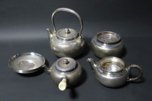 昭和初期頃に作られた茶道具の煎茶道具一式で、材質は純銀製で買取ました。ご覧のように凹み等無く非常に 保存状態 の良い茶道具の煎茶道具です。昔からの茶道具の煎茶道具で、写真12,13のようにこの茶道具の煎茶道具は 伝承 された日本ならではの 、職人技 の手打ちの地模様が綺麗に丁寧に施されており買取ました。また 急須 も 銀瓶 と同じように、手打ちの地模様が綺麗に施されております。持ち手は牙で作られ、内側も彫金細工の細かい 技法 が施され、高級な茶道具の 煎茶道具 で昔ながらの煎茶道具です。