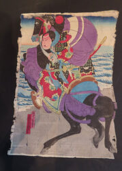 この作品は 骨董品 の江戸時代の浮世絵版画です。保存状態 が非常に悪い浮世絵版画で、保存状態が良ければ高価に買取出来る浮世絵版画ですが残念です。保存状態ですが、最初に作られたときは、周りに余白の縁が付いている作品が普通ですが、縁が無かったり、切れていると値打ちは大きく下がることもあります。一般的に三枚続きの作品も多くあり、続いている作品は物語になっており高価買取対象です。